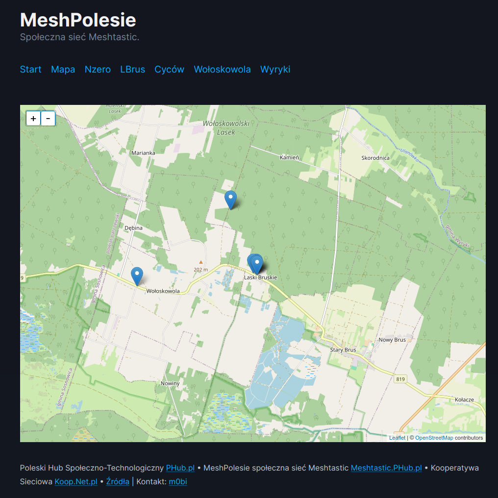 MeshPolesie posiada obecnie węzły w Laskach Bruskich, Nowinach, Wołoskowoli, Wólce Cycowskiej. Testowana jest komunikacja w Gminie Wyryki, od Lubienia do Adampola. Dwa węzły znajdują się we Włodawie. Chcielibyśmy docelowo komunikować się od Lublina, przez Łęczną, Cyców, Urszulin, Stary Brus aż do Włodawy. Zapraszamy gminy do współpracy.